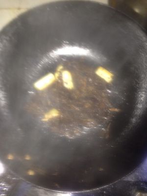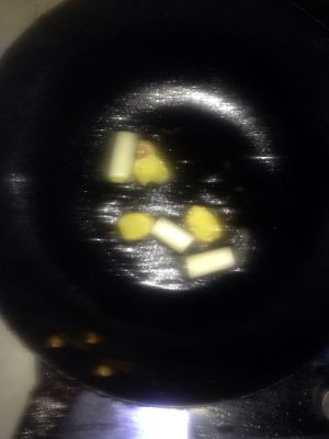 锅中煎肉剩的油加热到七成热,放入葱、姜各3片煸炒。