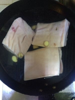 将五花肉切成大块放入锅中加入冷水,水一定要高过肉本身,同时放两片姜,两勺料酒。