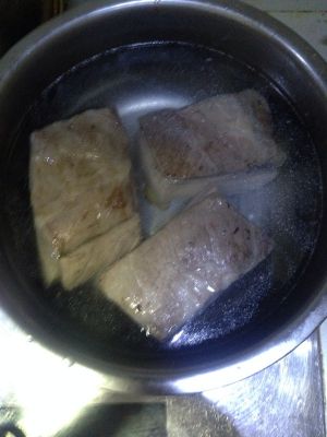 当肉皮煎成金黄色后捞出放入冷水中浸泡。