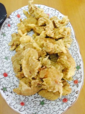 把腌好的肉加入蕃薯粉拌匀,油倒入锅中待热后放入肉炸置金黄捞起。