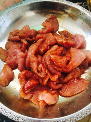 里脊肉切块,加入盐、酱油、鸡精、料酒腌制1小时入味