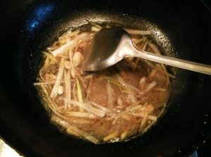 调料汁烧开用大勺子不停搅拌,放入肉片和香菜大蒜。颠几下勺。
