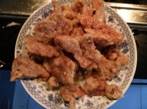 4.起锅烧油,油温五成热,把滚好干淀粉的肉片炸至微黄捞出,在把油烧至冒烟,在次复炸至金黄捞出即可。