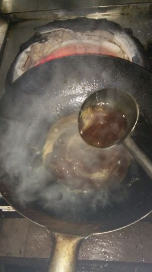 然后锅刷干净,锅里放一小碗水,放一些糖,等待糖已经化开并且稍微粘稠了,再放半勺醋,如果醋放多了糖味就会没有而且会很酸,如果醋放少了又会很腻。放完醋后放一小勺盐,再放一勺味精