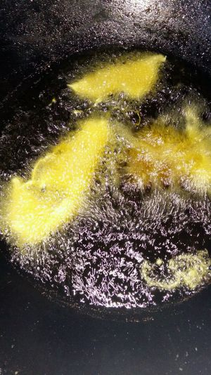 炸第二遍后,呈黄色,这个时候会很酥脆,如果沾着盐吃就是另一道回民菜啦