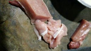切肉,不要太厚到时候不脆,不要太薄,到时候爱卷到一起,切厚的宝宝们,可以拿刀拍一拍,然后把淀粉加水,把肉放里