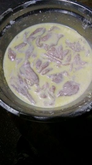 淀粉加水和少许油和成糊,放入肉片拌匀