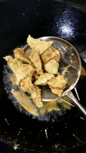 锅内放油,烧制三,四成热时,放入肉片炸制定型,捞出,将油温升制五,六成,放入定型肉片,炸制金黄色,捞出备用