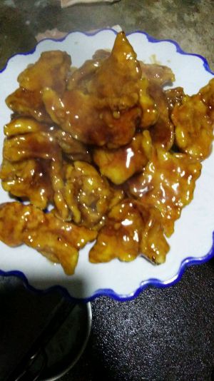 另取锅,放入一手勺水,加入碗汁,熬制枣红色,放入炸好的肉片,快速翻炒,使汁全部裹匀,淋明油,出锅装盘,撒香菜,白芝麻即可,。