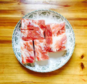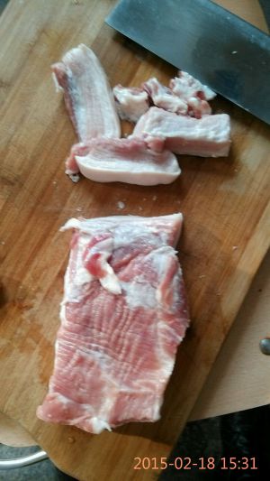1.将五花肉与凉水一起下锅,水开后在煮2-3分钟。然后关火捞出,用温水洗去血沫,切成块状待用。