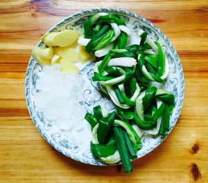 将生姜去皮洗净后切片、大葱斜切成片、香葱切成段后打结