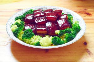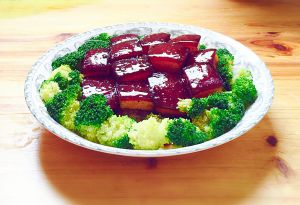 将西兰花均匀的摆放在五花肉的周围,然后淋上肉汤汁,一道美味可口的东坡肉就完成了。