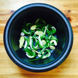 将葱结、姜片平铺在电饭煲里。(为什么要用电饭煲?原因很简单,铁锅煮肉颜色会变黑,如果家里有砂锅也是可以的)