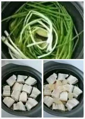 把生姜大葱一起铺在锅的下面,我用的炖锅,你们可以用不粘锅,普通锅都可以,只是闷的时间不一样