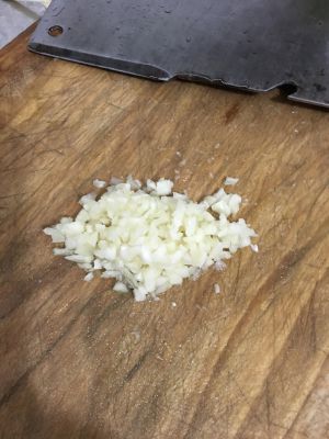 准备容器内放入蚝油2勺、淀粉半勺,为了不使淀粉结块儿,先将淀粉和蚝油搅拌融合后加入水继续搅拌均匀即可,待用;切蒜瓣儿,待用