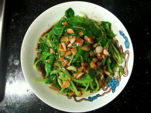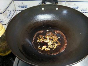 锅中放少量油7分热,放蒜炒香,再放耗油翻炒