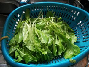 这是自家阳台种的,嫩着呢。生菜洗净,蒜切碎。锅里水开后放勺盐(主要是保持菜不发黄)把生菜倒入,等水再次开后,关火。把菜盛入盆里,沥掉水分。
