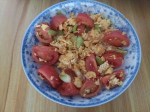 在锅中放入适量的油,将搅拌均匀的蛋放入锅中炒熟,再倒入番茄,加入盐味精适量。翻炒几下,再加入蒜,炒几下,即可出锅。