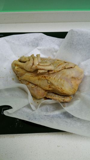 这时候鸡肉差不多腌好啦,用烘焙纸把鸡肉包好。压着边包一定要包严实,不要让汤汁漏出来。把鸡肉放入电饭锅中开到煮饭模式就不用管了。