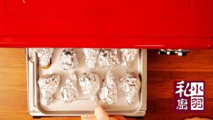 ▲烤箱提前预热到200度,大概需要15-20分钟的样子,就可以把包好的鸡翅放进去啦。用热风循环功能,烤20分钟就行啦。
