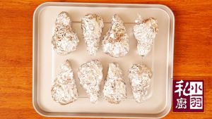 ▲准备好铝箔纸,亮面朝外,把腌好的鸡翅包起来,裹紧,摆在烤盘里。