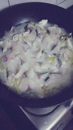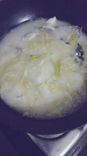 后下酸菜炒,加适当盐,一点糖,下水煮开,煮开后就放略煎一下的鱼头鱼块煮熟