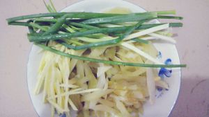 第二步:准备好酸菜、生姜、小葱或香菜,酸菜好、生姜切丝,我是小葱和香菜选择一样