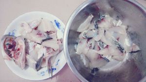 把鱼清洗干净,骨头和肉片分开,骨头放锅里煎黄。
