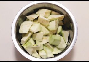 茄子去皮切块,放一小勺盐,腌制10分钟。