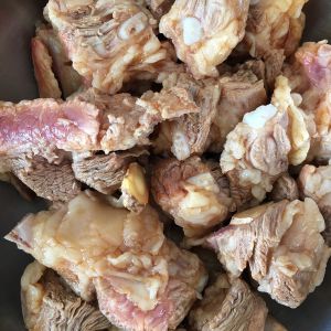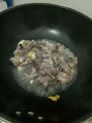 小排切段洗净(可以热水中焯一下),锅中适量热油,放入排骨翻炒片刻,盛出。