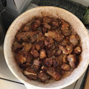 锅中加适量油,加冰糖,小火炒融化。放入排骨翻炒上色。加适量热水,没过排骨,加少许料酒、生抽、醋。小火炖一小时左右,汤汁快干时,加老抽大火收汁。出锅前加少许醋翻炒。