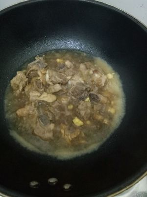 锅内留底油,大火烧热后放入葱段和姜片爆出香味,倒入炸好的排骨,然后加入少量生抽,适量老抽,炒匀,加开水没过排骨的表面。