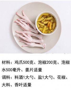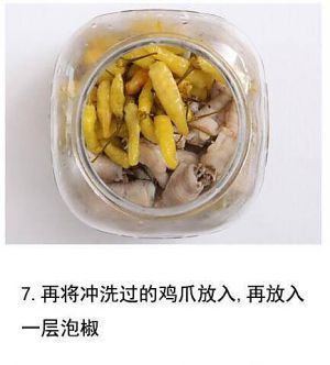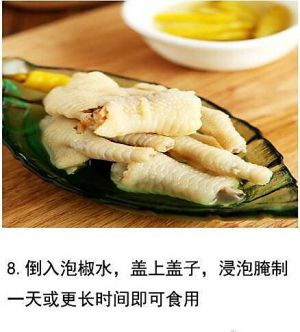 这是我第二次又做的泡椒凤爪: 鸡爪剪去指甲,放在沸水中焯水3分钟捞出,放在水龙头下冲洗干净鸡爪上的浮沫,放在冰水中浸泡半个小时捞出沥干水分。盆子里放入鸡爪,配菜(洋葱,胡萝卜,红米椒),冰糖一包,泡椒一瓶,盐适量,鸡精少许,白醋适量,矿泉水适量,水没过鸡爪即可。用保鲜膜密封放进冰箱冷藏2天即可食用。放一点儿鸡精提鲜,白醋和水的比例我基本上放的1:1,泡椒里面的泡椒水要一起放进去,盐的量以尝着咸味略重一点点就行。因为很辣所以不用腌得很咸也够味。糖最好用冰糖,用鸡精的量不是很多,半茶匙足够了。