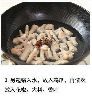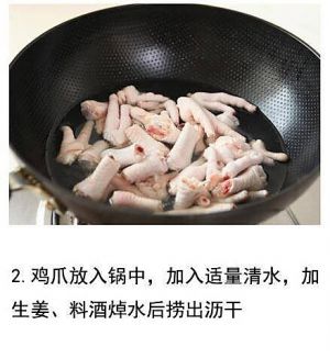 锅里放水,姜片,一根葱,烧开后加入鸡爪,大火烧开,中火煮10分钟,捞出用冰水泡半小时,沥干水分