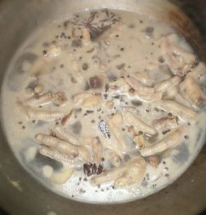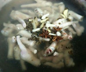 锅中加适量水,放十几颗花椒,花椒在煮的时候会散发出香味,而且可以起到去腥去油腻的作用。水开后,把处理好的凤爪放进去。