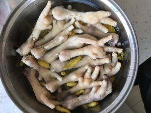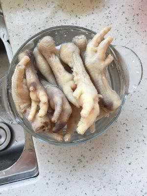 将鸡脚洗净,将指甲去掉放入锅中,加水,盐,鸡精,味精,香菜,小葱,花椒籽,料酒煮10分钟左右,熟透即可,捞出后冲凉(尽量将油冲掉),完全冷后捞出沥水。净郭烧开水凉凉备用。