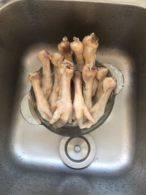 将煮好的鸡爪捞出冲水洗净油脂,一定要放大水多冲一会,这样冷却速度快鸡肉有嚼头