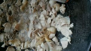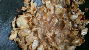 锅中放入一点食用油,将五花肉倒入翻炒出油(喜欢什么程度的肉就炸到什么程度,依个人口味调整),加入盐巴,生抽,蚝油,白糖,料酒翻炒,炸出的油倒出