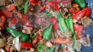 加入青红椒,炒熟辣椒即可加入切好的蒜苗翻炒两下出锅。