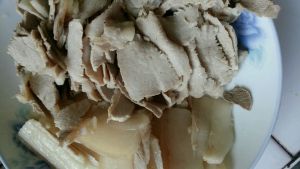 将猪肉煮熟,煮的时候加姜以去腥。肉要选这种带皮子的,肥瘦凭各人喜好。