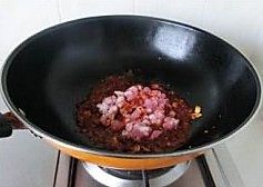 炒锅中入油加热,待油4成热时(手置于锅上方,能感温热)倒入肉末,炒散至脱生盛出(碎牛肉一定要煸炒至酥香,一颗颗,一粒粒,入口香酥)。