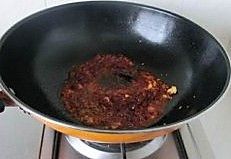 大火爆香,小火加入豆瓣酱,加水,水一碗,千万水不能多哦
