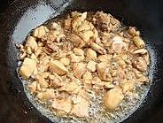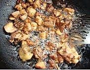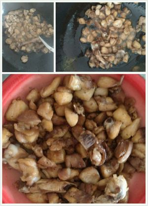 起油锅,油稍稍多一些,把鸡块放入煸炒,将鸡肉里的水分炒出,炒至干香, 盛出。