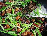 咸度不够的话可以加少许酱油,但是量不要太多,最后加入白芝麻、韭菜段(我是家里正好有,为了处理韭菜就放了,如果没有韭菜就可以省略哦),再煸炒一两分钟即可。