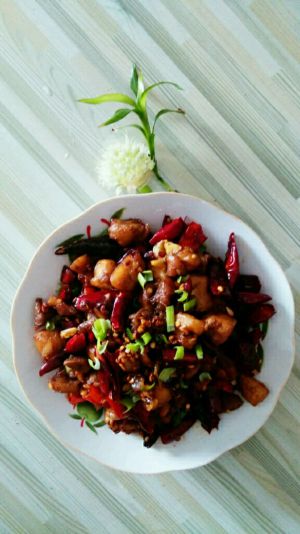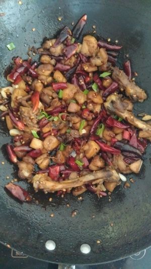 坐等下油,放蒜,花椒下锅炒香,放芹菜下锅,翻炒十五秒后,到入鸡块;加入,干辣椒,糖翻炒(也可以加入芝麻)! 最后放盐,和味精,翻炒几下就可以出锅了!