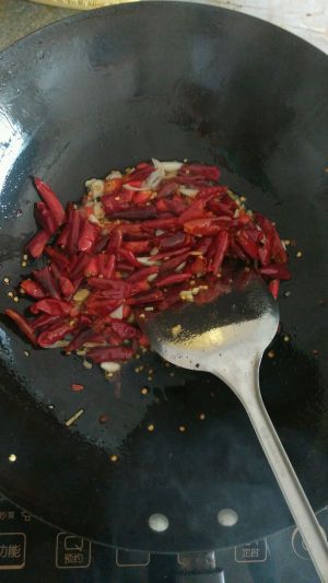 开始炸锅,油热以后放入干辣椒,花椒,蒜丁,姜丁,小葱块,红尖椒丁慢火煸香。