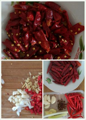 如图:将大蒜拿刀拍碎切小块,大葱滚刀切小块,干辣椒一掰二,新鲜红尖椒切小丁,生姜切丁。(切好的大蒜和大葱分两份,炸锅一份,出锅时一份)花椒和炸锅料放一起以备炸锅。