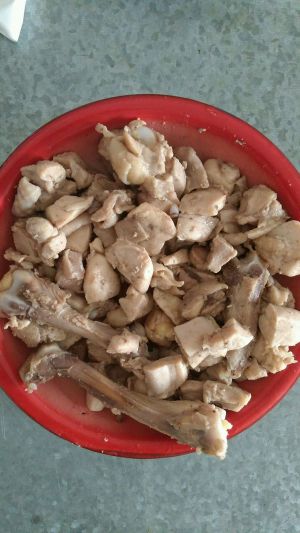 鸡腿切小丁拿水焯一下,然后再拿清水洗干净备用。