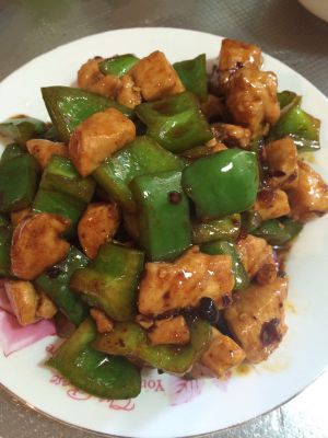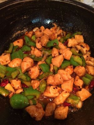 锅底油,依次一汤匙豆瓣酱和老干妈,改小火,慢慢炸出红油,调至中火,然后放入姜蒜爆香,放入预先的鸡丁和青椒煸炒片刻,放生抽、盐、糖,出锅烹醋,少许湿淀粉收汁关火。