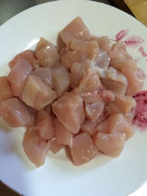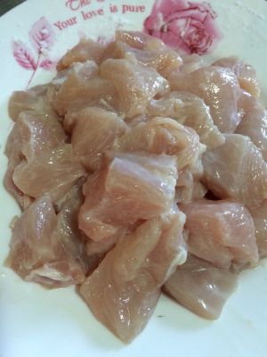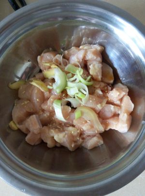 鸡胸肉切丁,用水洗净沥干水分。加入葱片姜片、盐、酱油、鸡精/味精、料酒和少量干淀粉拌匀,腌制半个小时。